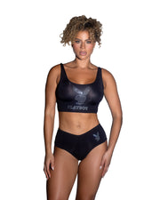 Spandex cropped tank•Heat transfer rhinestone logo•Cheeky briefs•Cotton gusset