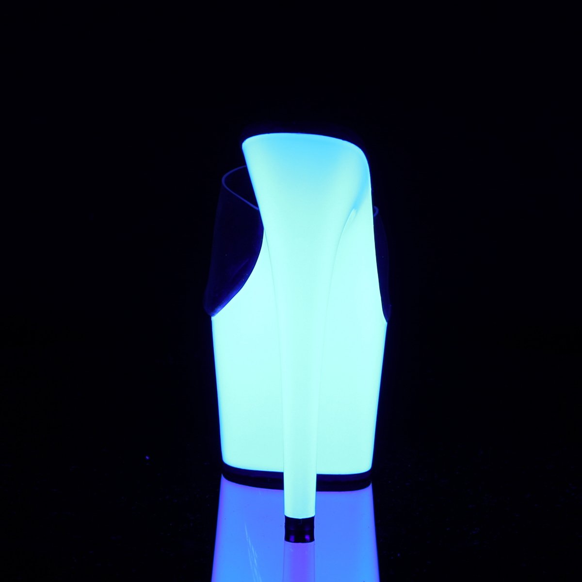 Platform Slide Featuring Curvey Lines Ultraviolet Blacklight Effect. The glitter is UV reactive and glows under the black light. This sexy shoe has 7 inch stiletto heel. Clear Single wide strap with open toe these mules will give the impression you are walking barefoot, thus enhancing your height and sculpting your feet for a provocative look.