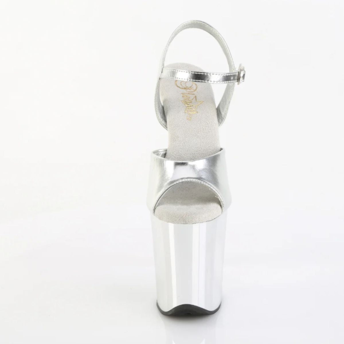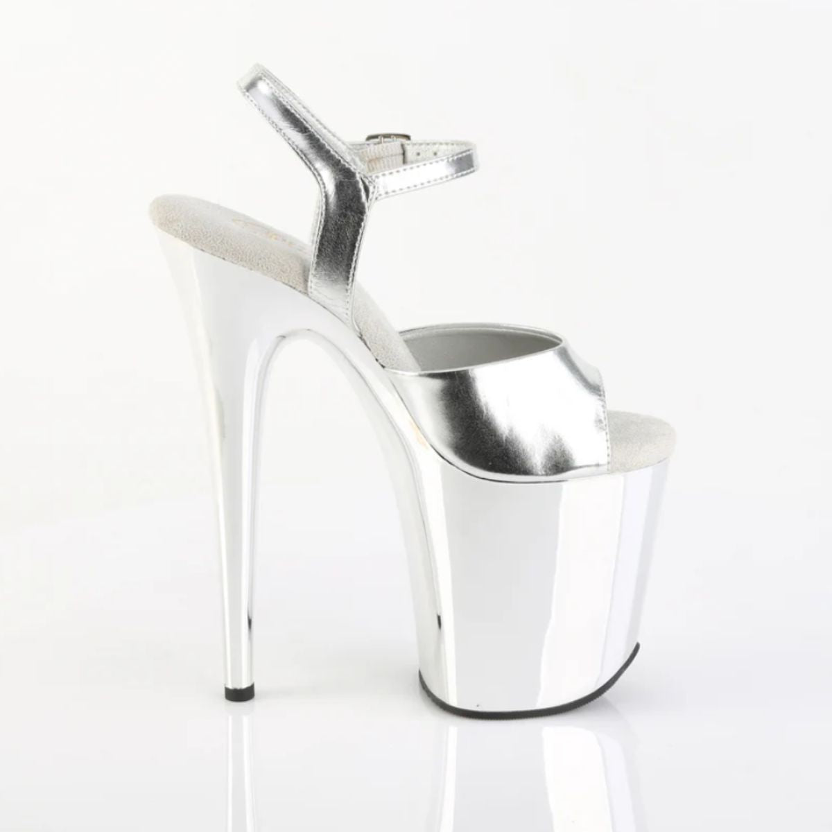 A platform ankle strap fetish sandals with top wide strap and thin side straps supporting a delicate ankle strap with side closure. The dramatic 8 inch (20 cm) high heels are the centre of attention in these super sexy sandals, while the front platform completes the look and adds further stability and comfort for the feet.