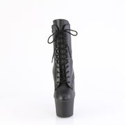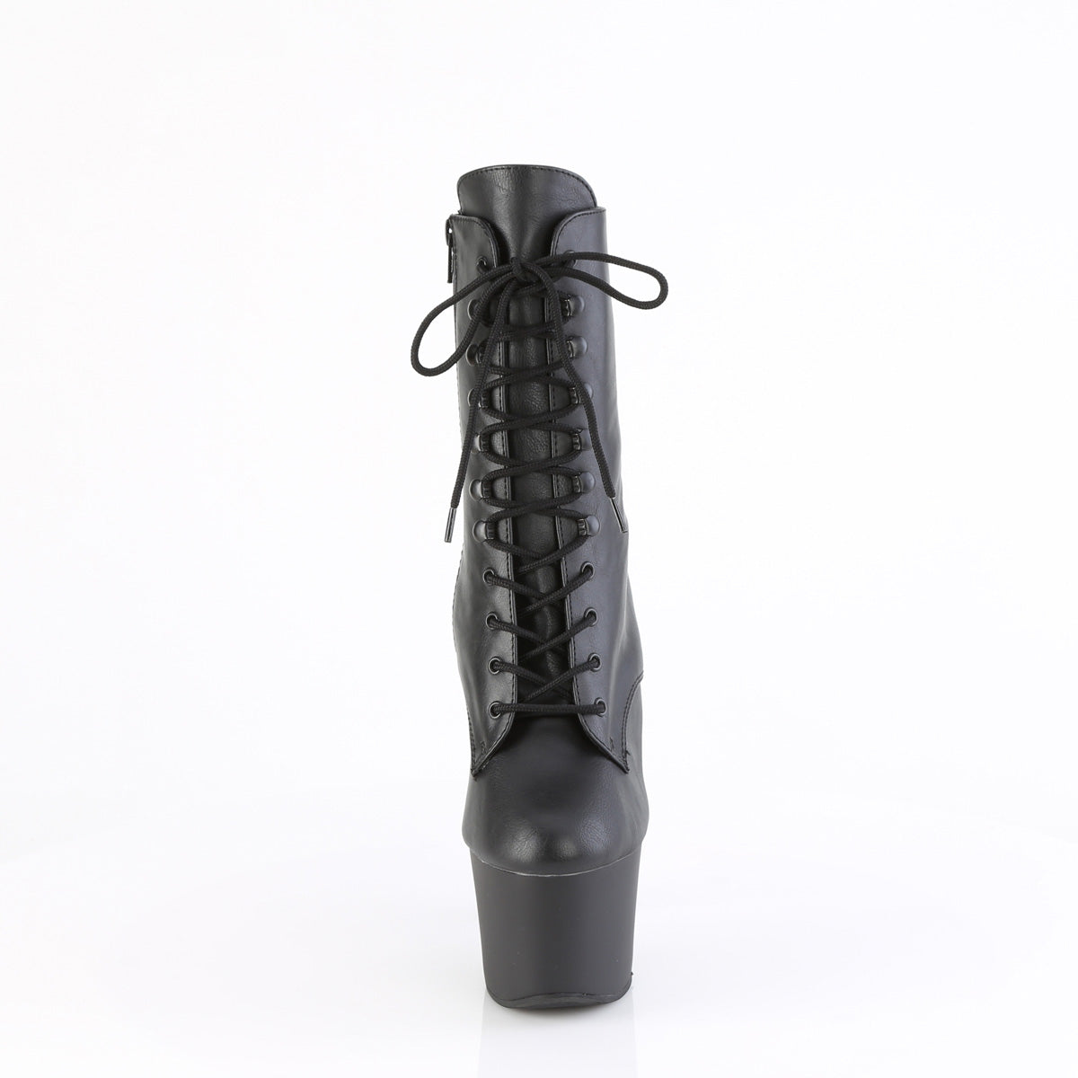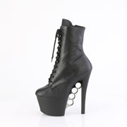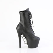 Step into power and sophistication with these ankle boots, boasting a 7" (178mm) heel and a 2 3/4" (70mm) platform. The lace-up front, complemented by chrome plated brass knuckles on the platform underside, adds a touch of edgy elegance, while the inner side zip closure ensures convenience and comfort.