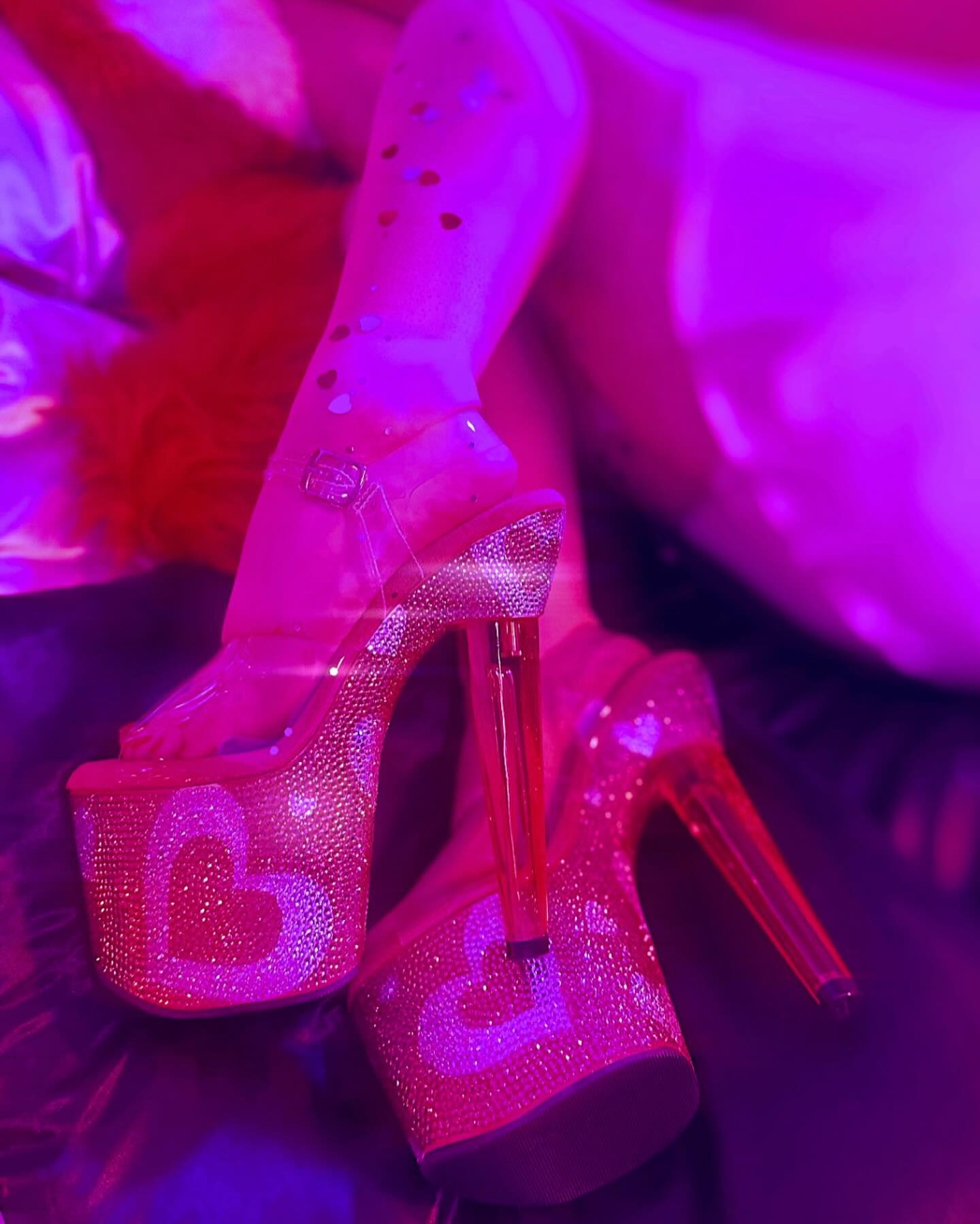 Wear your heart on your heels! Gorgeous 7" (178mm) heart shaped heel, 3 1/4" (83mm) platform ankle strap sandal with tinted heel & rhinestone embellished platform bottom featuring contrast color hearts.