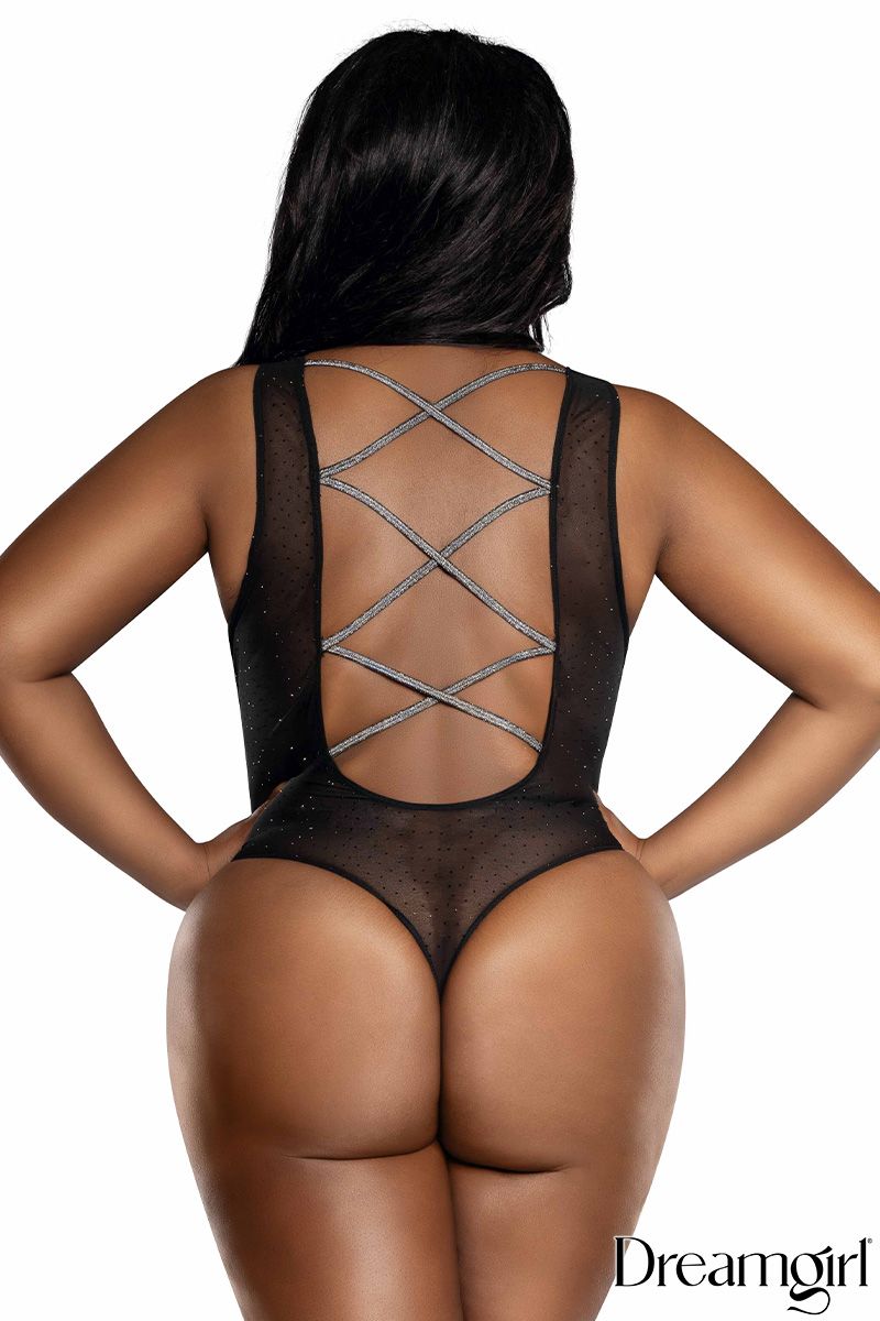 Sheer mesh teddy with sparkling rhinestones all-over, a square neckline, thick fixed straps and a plunging open back featuring silver criss-cross elastics.