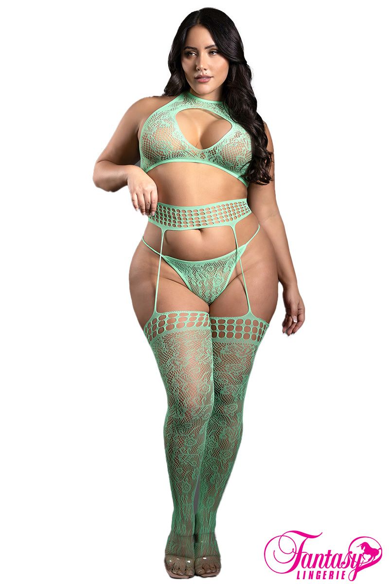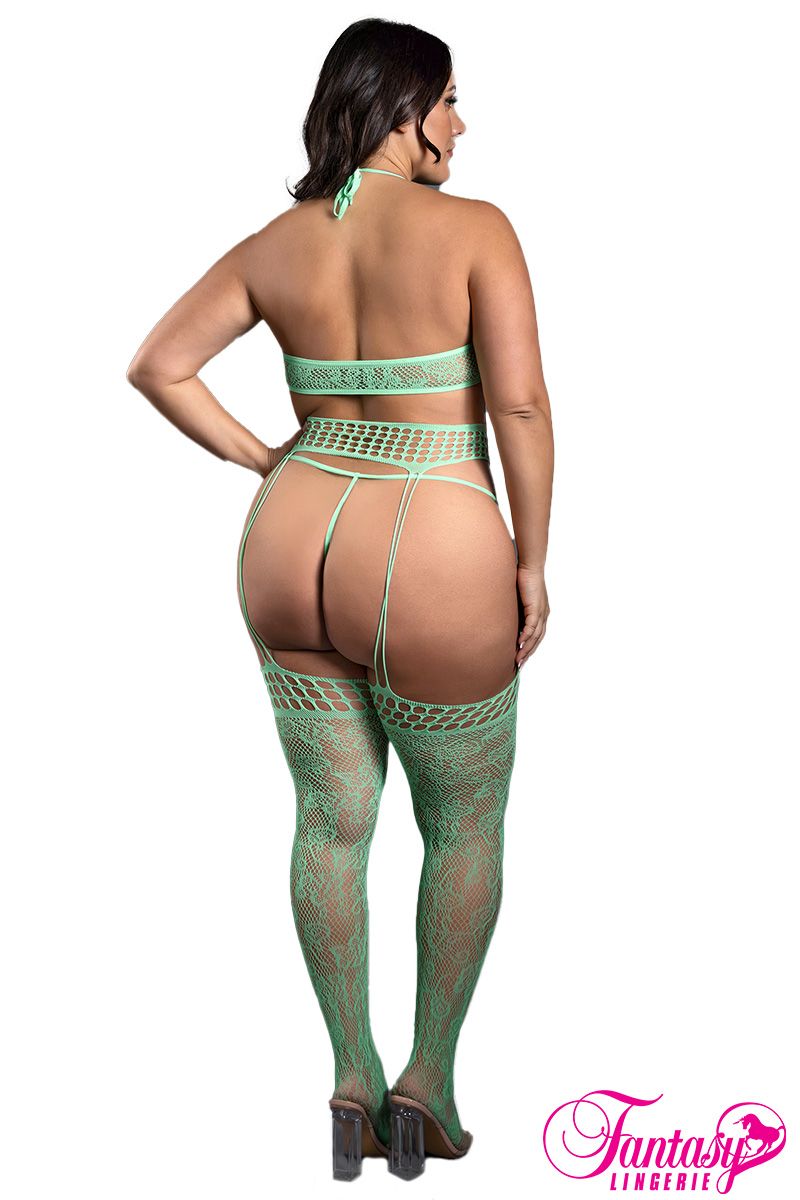 High neck lace top with a front round cutout and a halter tie-neck collar. High-waist net garterbelt and attached elastic garters linked to the matching thigh high stockings. Lace G-string