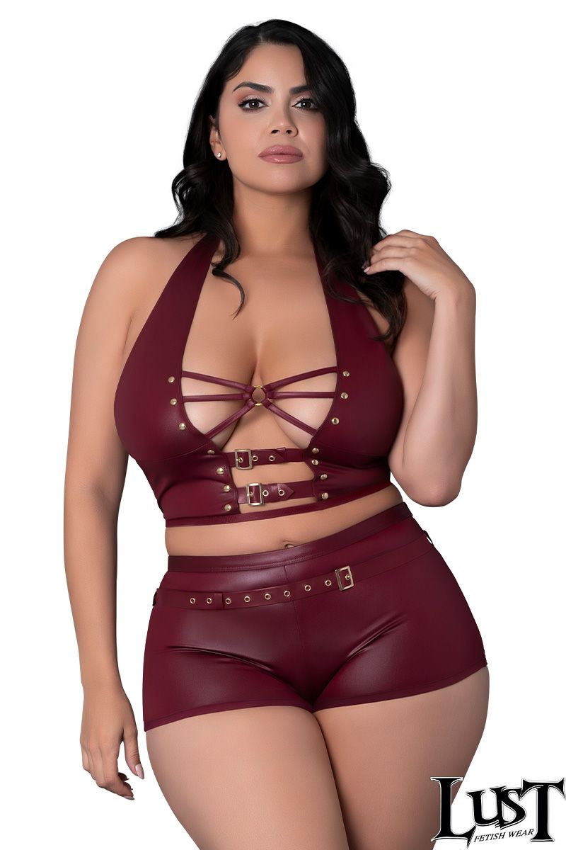 Glossy four-way stretch wet look top with adjustable buckles over the plunging front, decorative strappy elastics over soft cups and a halter tie-neck collar. Sleek high waist shorts with a wide waistband.