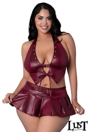 Glossy four-way stretch wet look top with an adjustable buckle over the plunging front, soft cups, a halter tie-neck collar and a tie-front closure. Pleated mini skirt with a wide waistband and G-string.