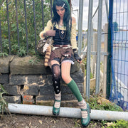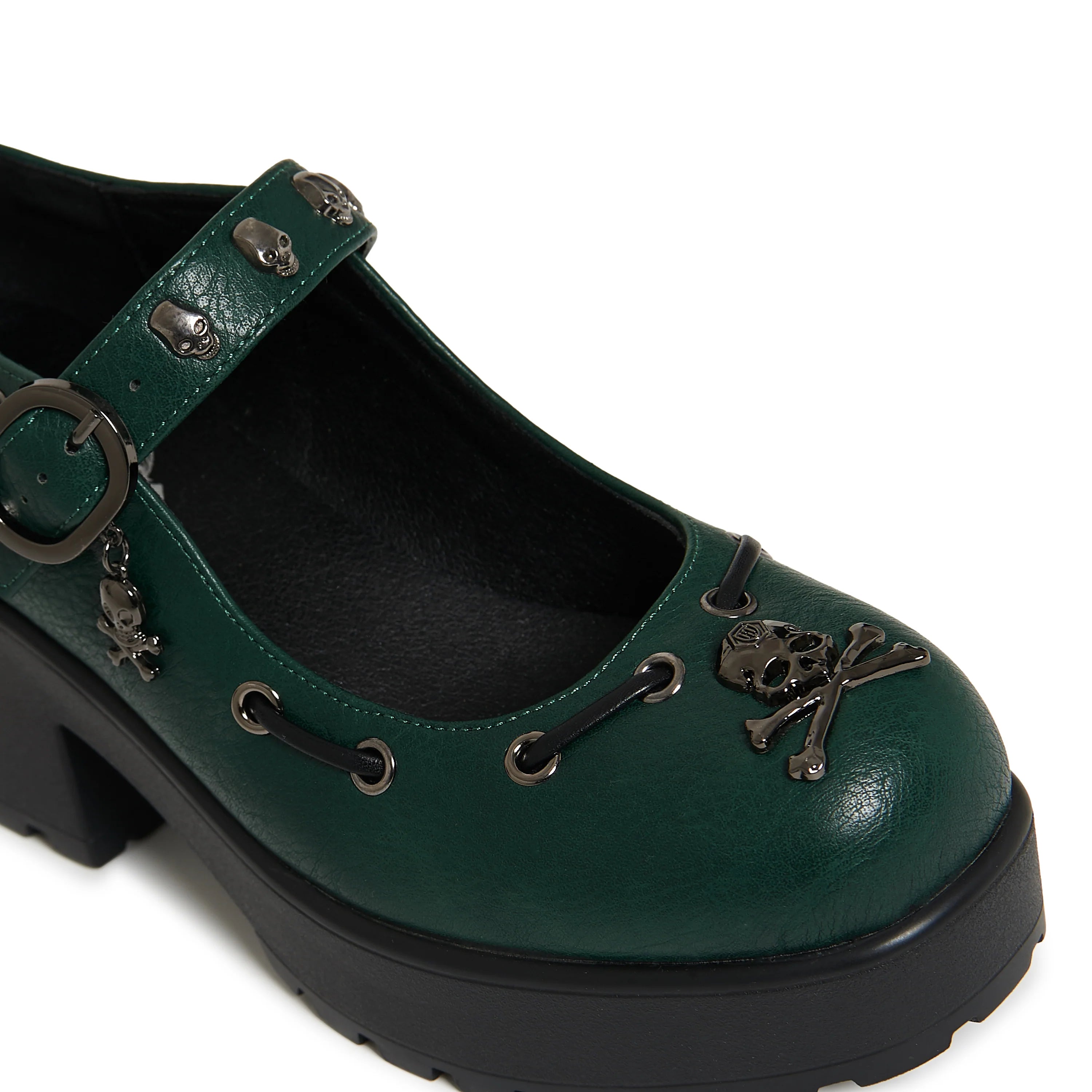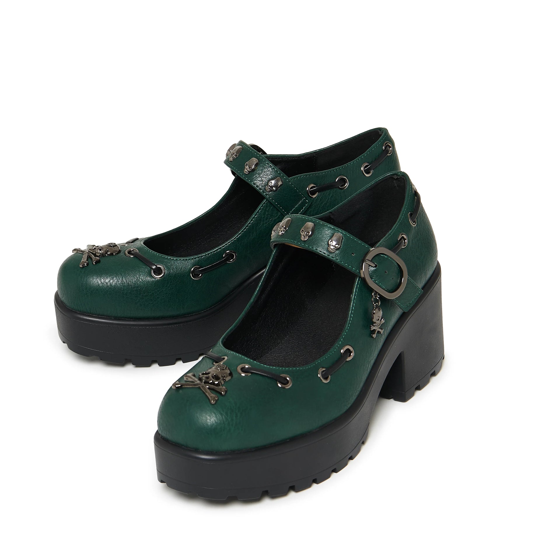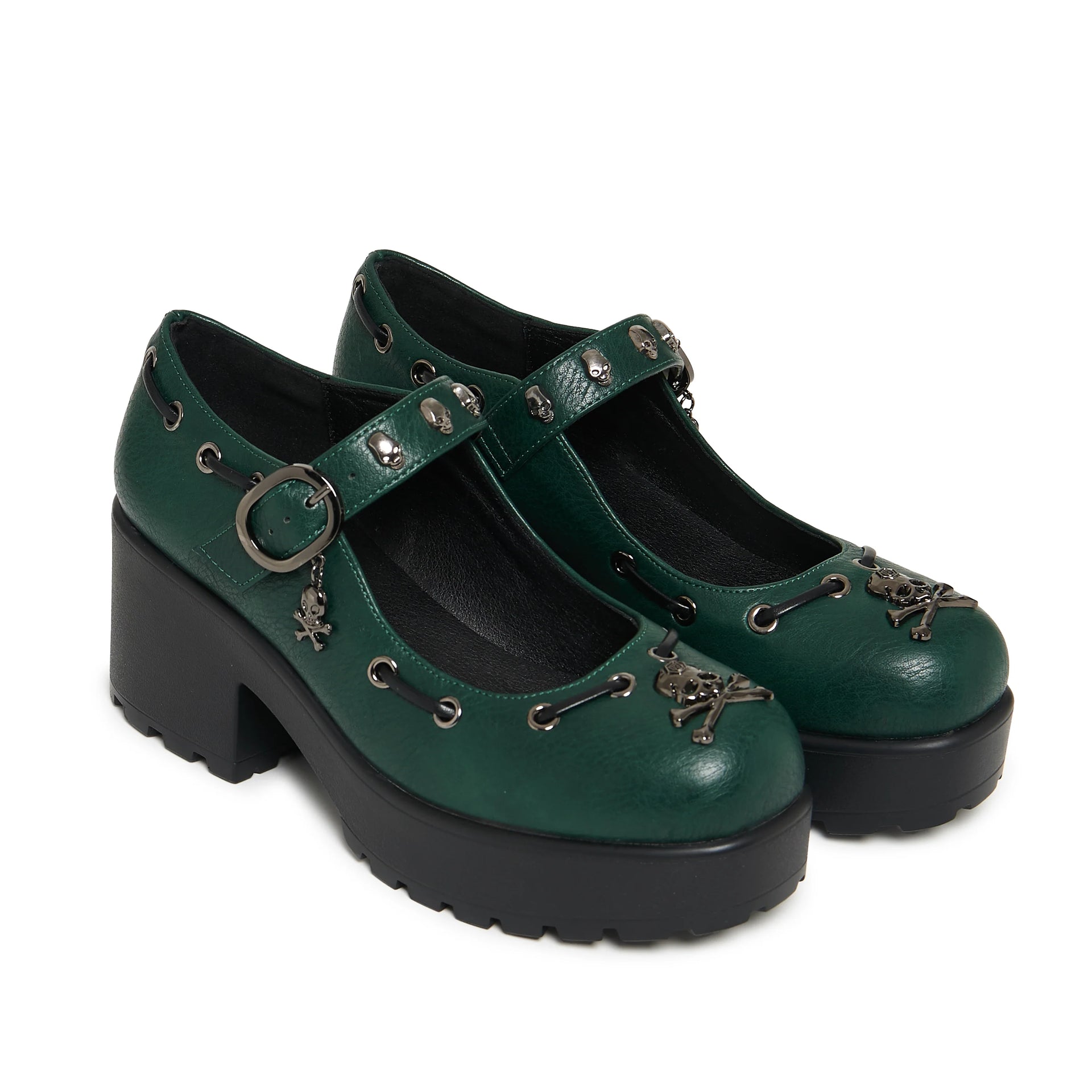 The Tira Juniper Mary Janes are your new go-to for stomping through enchanted forests and underground gigs. Drenched in deep forest green vegan leather and laced with stitched eyelet details, this style is pure earth-tone magic. Finished with black metal skull hardware, charm details, and a sturdy block heel, they’re unapologetically grunge—but still totally wearable.