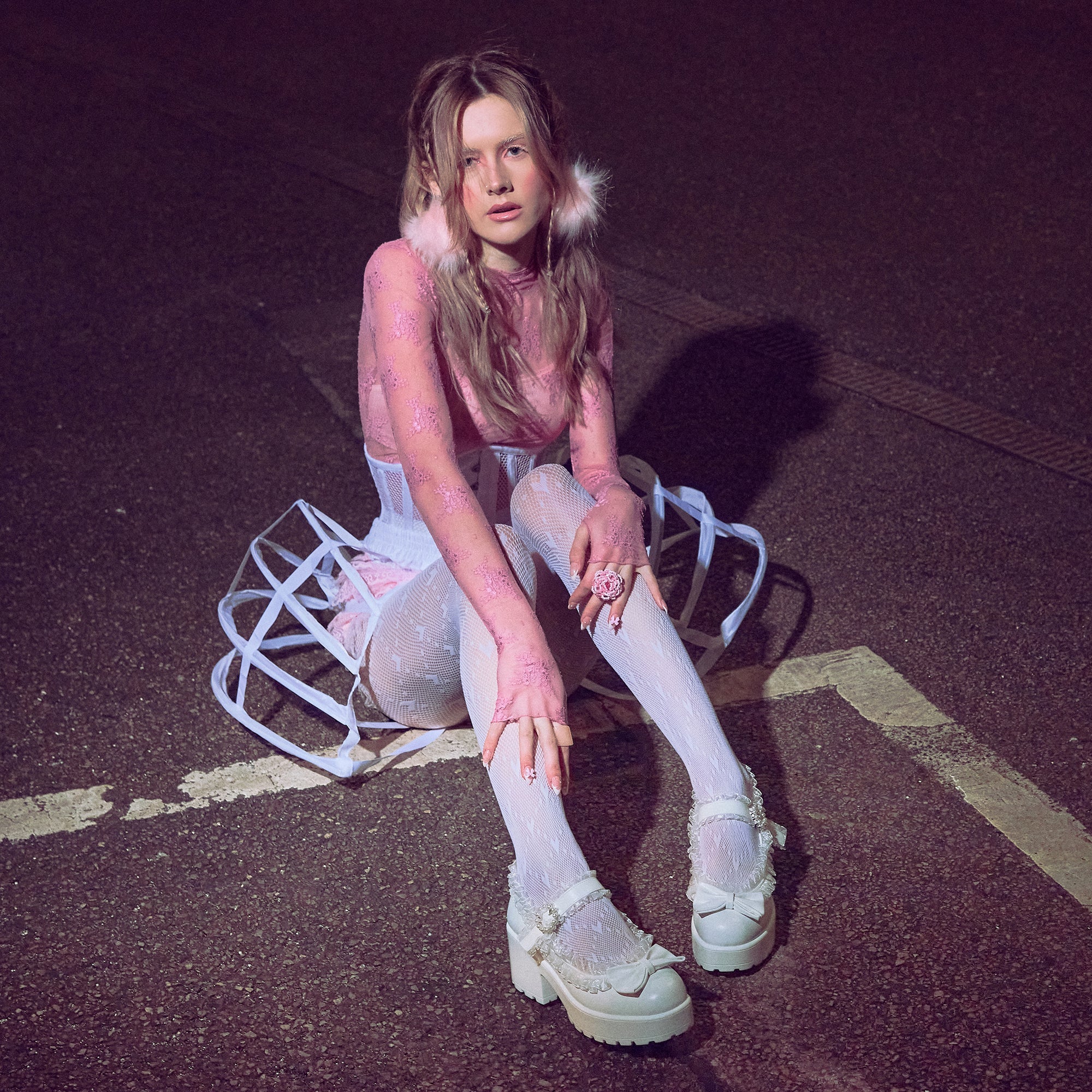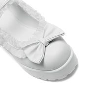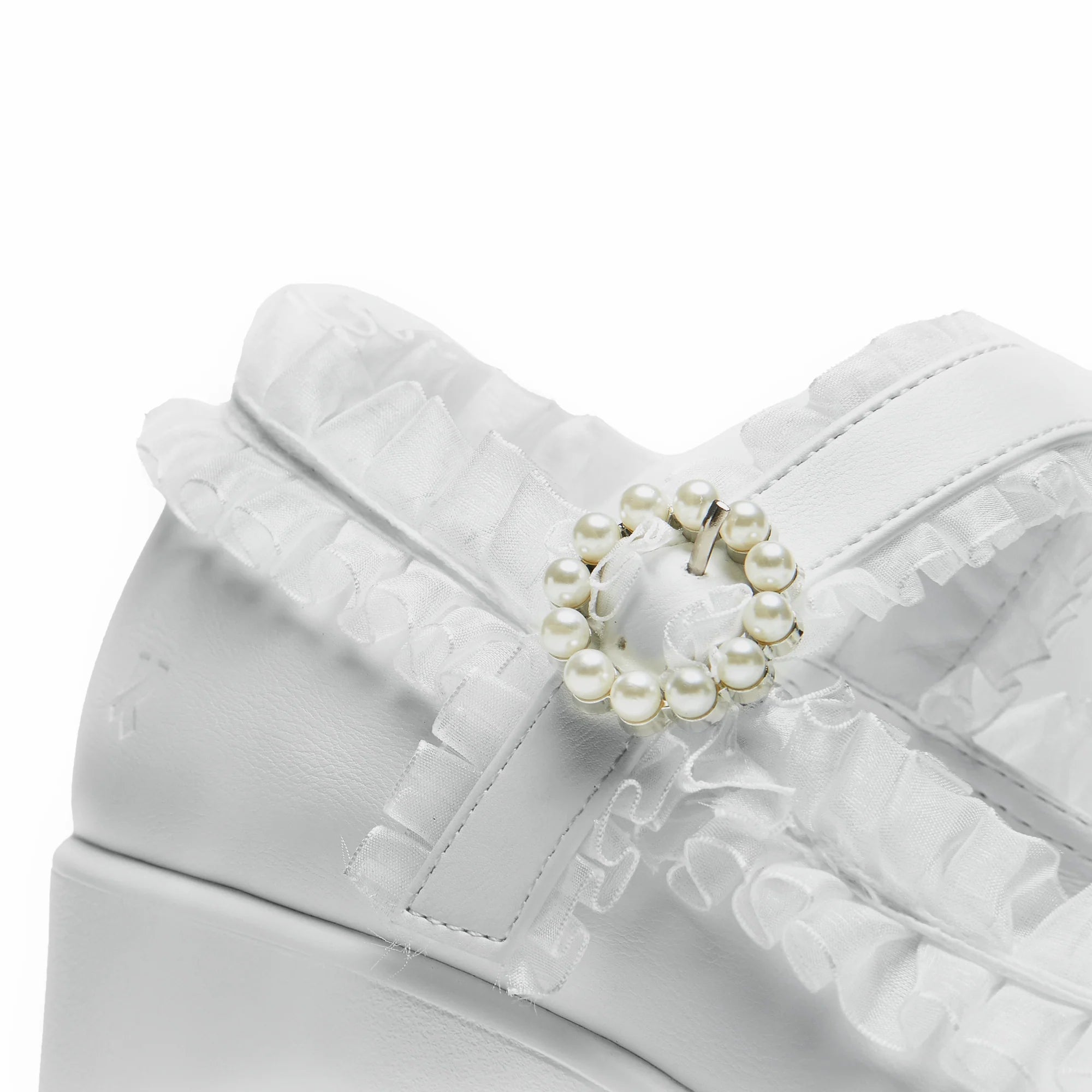 Imagine our iconic Tira Mary Janes, but made into something that resembles what a vintage porcelain doll would wear, featuring hauntingly cute translucent ruffling all around the edges, and across the strap. The white colourway makes this mary jane have a ghostly yet sweet beauty. We tested these internally to ensure the ruffling sits in a comfortable position. The bow on the front is stitched on and in matching faux leather calling back to the vintage inspiration. The circular pearl buckle creates a glistening allure whenever it catches the light just right.