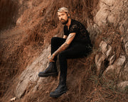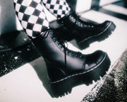 Wear them your way. Has an all-black upper made of our high quality TUKskin™ material — polishable synthetic faux leather that is both soft and breathable. Features a 10-eyelet lace up detail and a platform height that stands at 2”. Has screws in the sole for extra allure. Comes with removable memory foam insoles for added comfort.