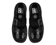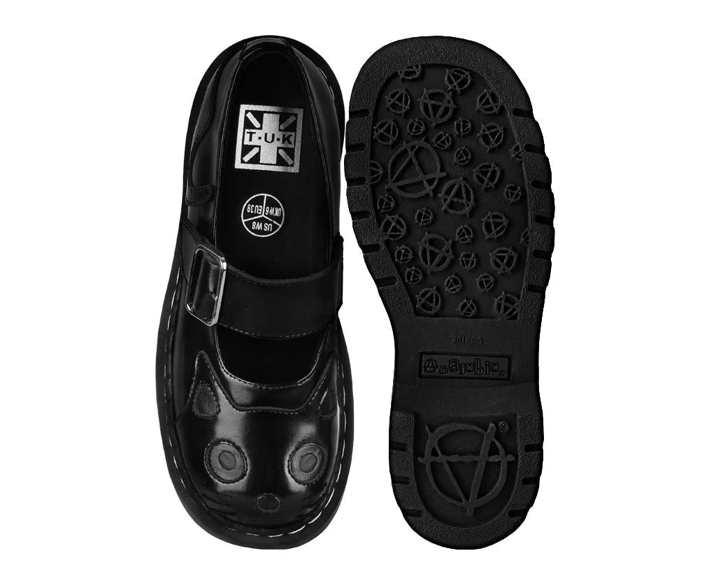 All Black Leather Kitty Maryjane with black stitched details, a Silver Metal Buckle, and a 1 1/2 inch Heel.