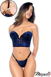 Longline velvet bra with underwired cups, adjustable detachable straps and an adjustable ribbon lace-up back. Velvet thong with adjustable sides.
