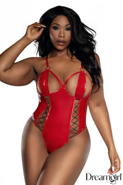 Wet look vinyl teddy with fixed lace-ups over the front, elastics around underwired cutout cups, adjustable straps, a back zipper closure and a thong-cut bottom.